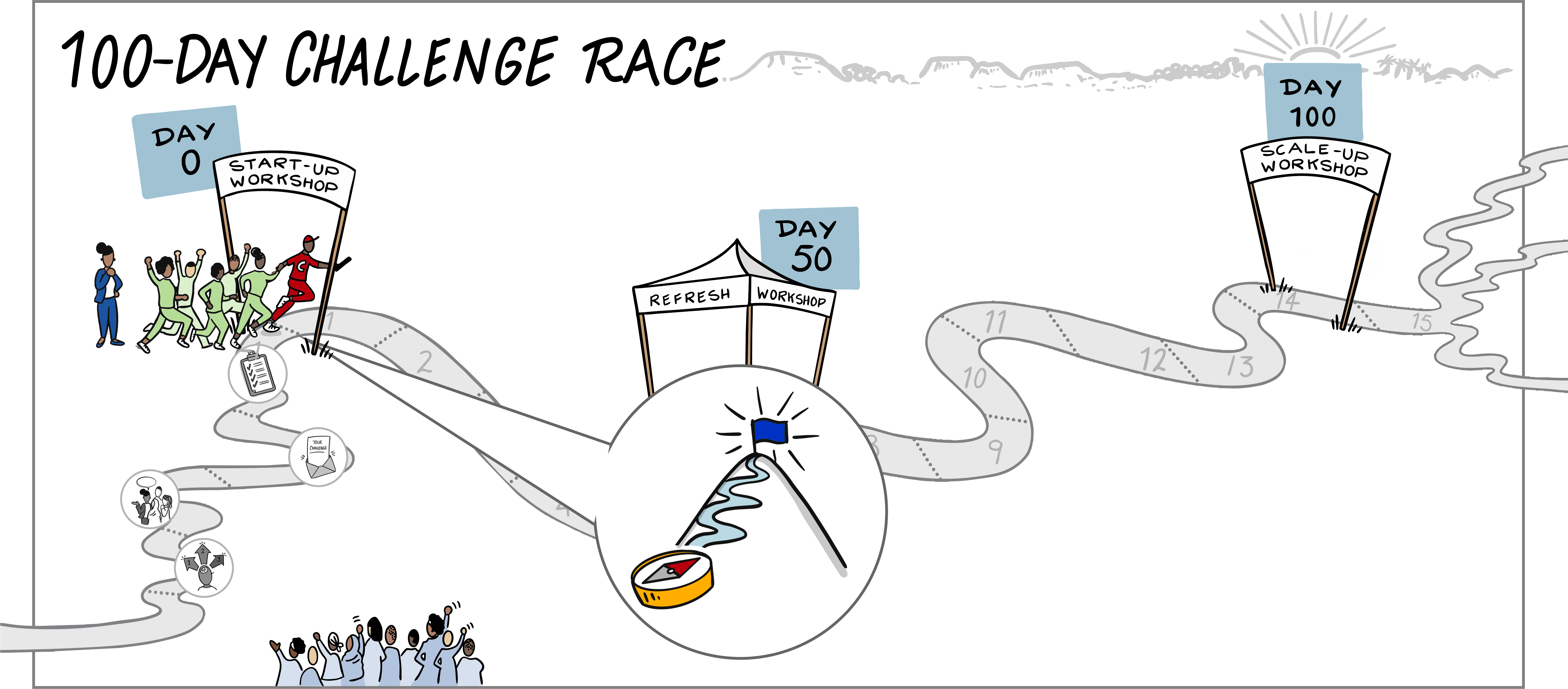They will participate in the last part of the Refuelling Workshop, halfway through the 100 days, to see what additional support the team needs, and to begin to plan with the team for sustainability and scale-up.