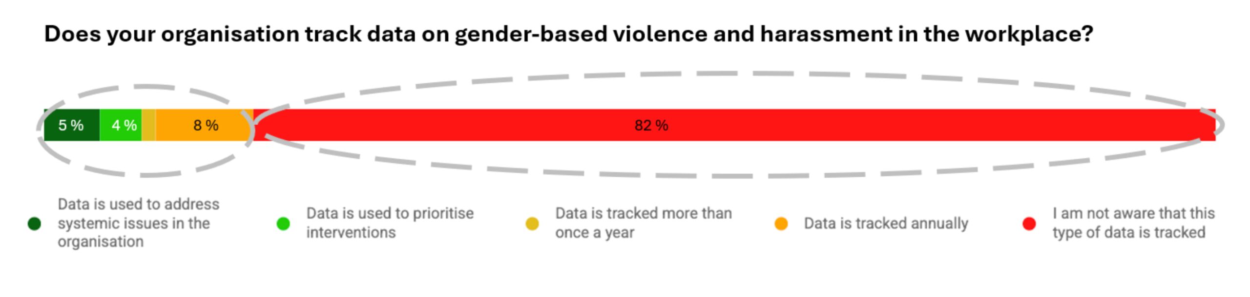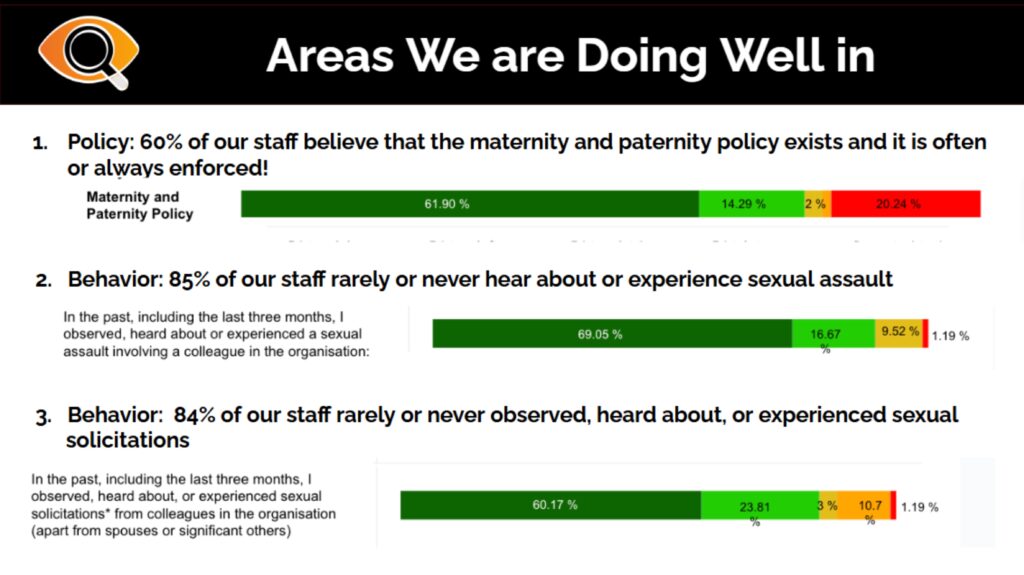 This example suggests that 82% of staff are not aware that the organisation tracks data on gender based violence and harassment in the workplace. If their perception is wrong, this would be an easy fix that does not require a 30-Day Project: If they believe it would help, and it often does, leaders can start publishing this data in the organization’s internal newsletter.
