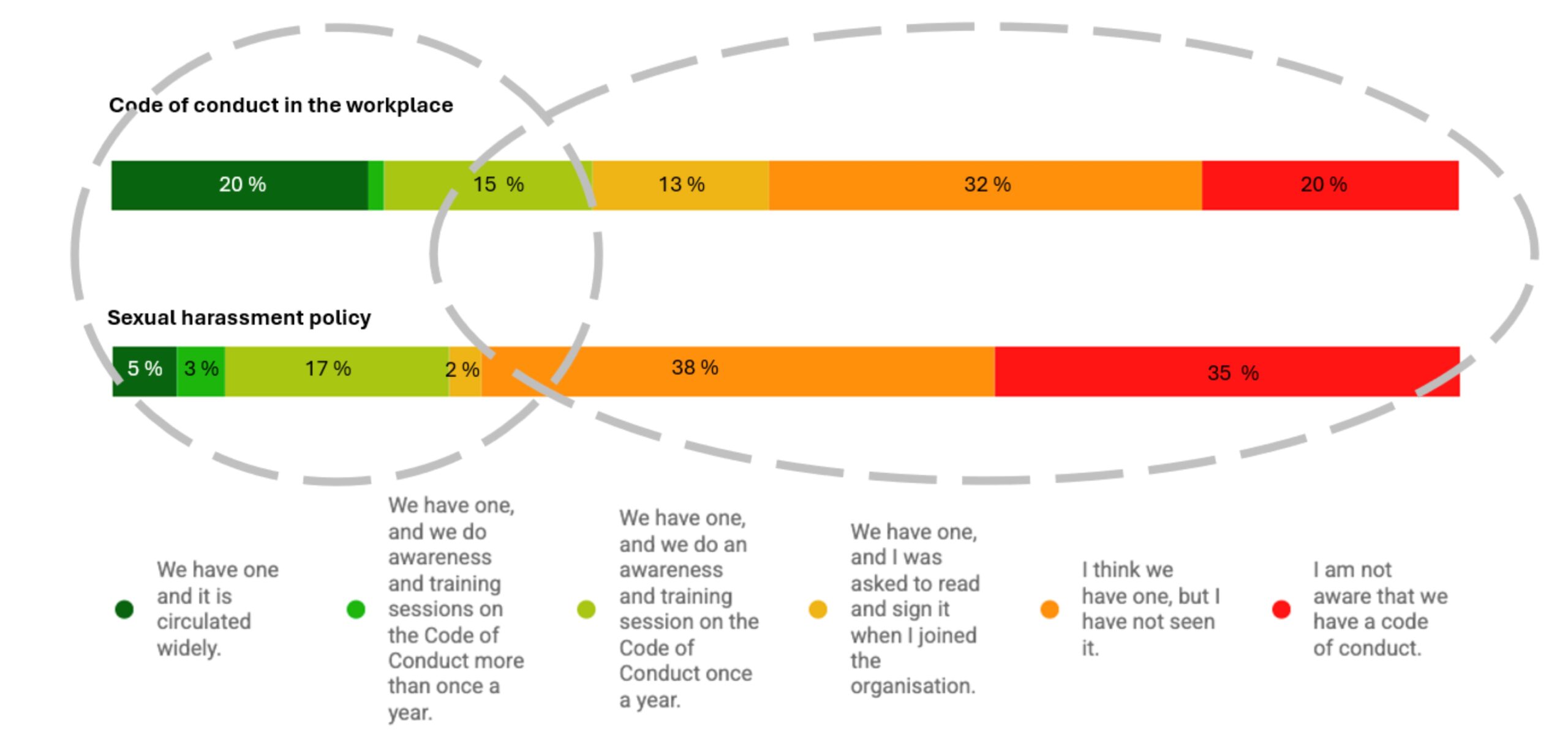 You can see from the second bar that about 73% (35% + 38%) of staff have not seen the sexual harassment policy, and the majority of them do not think it exists. This could be a good candidate for the focus of a 30-Day Project: getting more staff to be familiar with the sexual harassment policy.