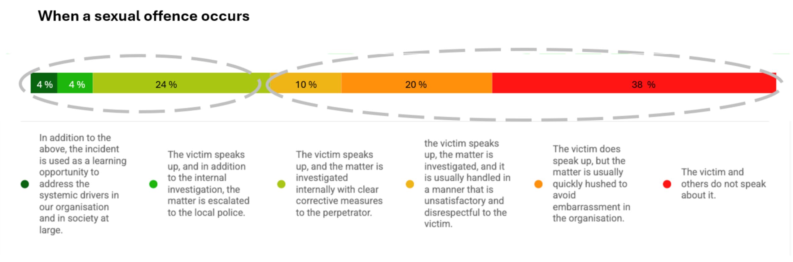 Here you can see that about a 1/3 (38%) of the staff believe that victims of sexual offences committed in the organisation do not speak up. And another 1/3 (20% + 10%) believe that when victims speak up, the matter is hushed or handled in an unsatisfactory or disrespectful way (from the victim’s perspective). So increasing the number of victims who speak up may be a good focus area for a 30-Day Project.