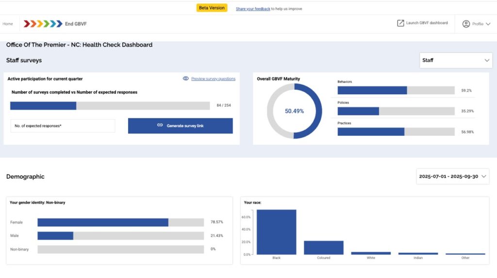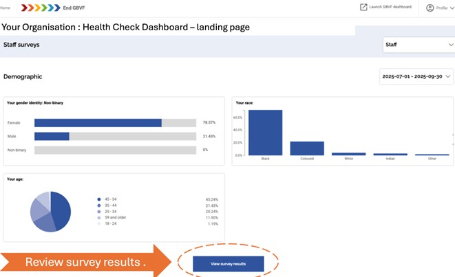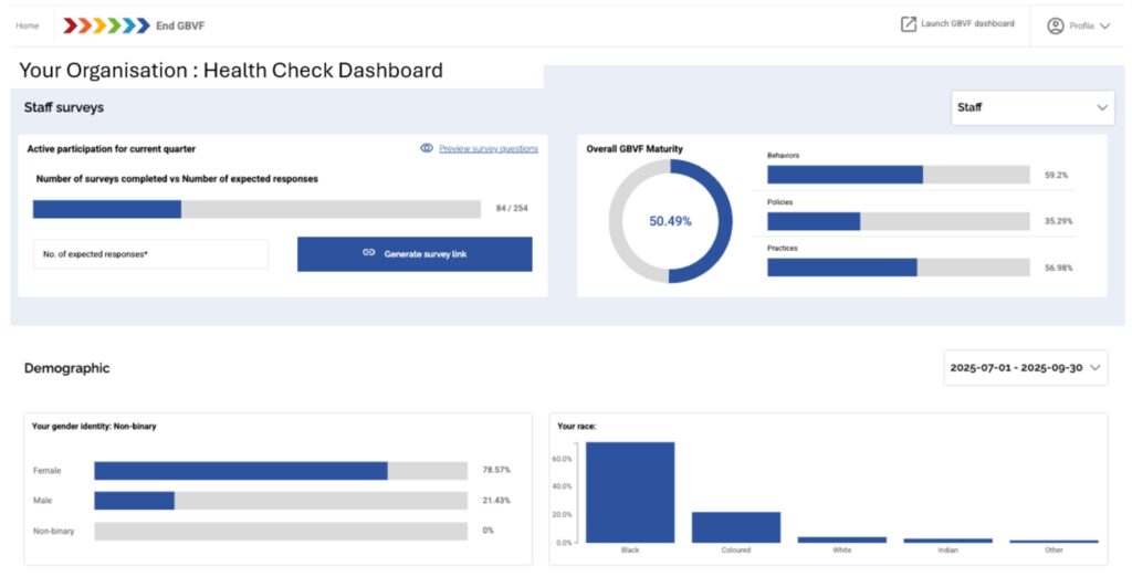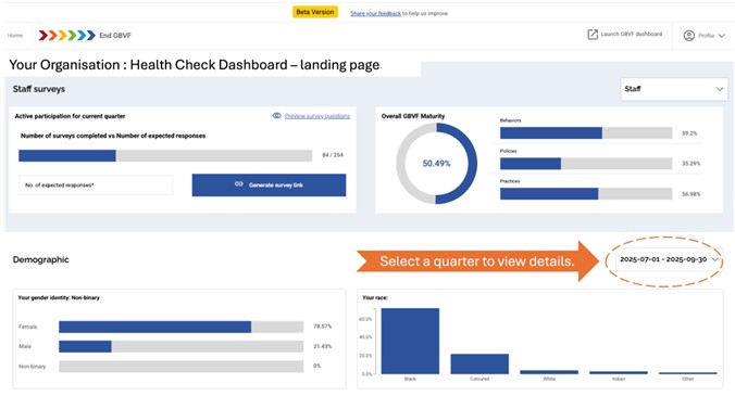 You will see the following summary of your organisation’s GBVF maturity, as well as demographic information about the survey respondents in the organisation. Please take a screen shot of this and insert it into your slide presentation to the leadership group.