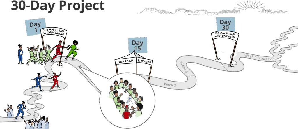 They will participate in the last part of the Refuelling Workshop, halfway through the 100 days, to see what additional support the team needs, and to begin to plan with the team for sustainability and scale-up.