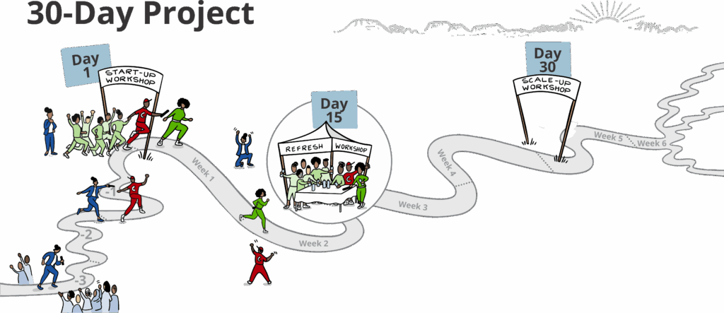 This week, your team will have their Refresh Workshop. They are halfway through their 30-Day project. It’ll be a chance to pause, reflect, and reenergize before continuing the race.