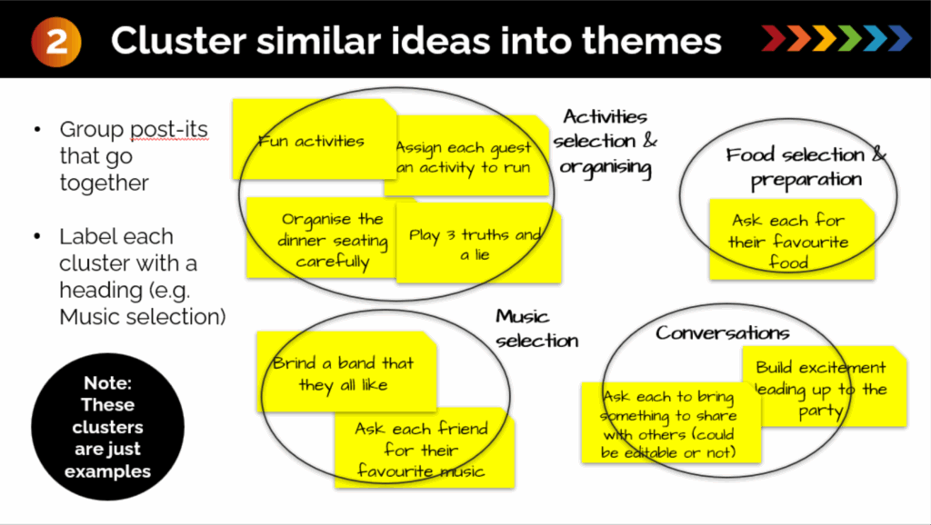 Ask the group to start clustering the post-its that go together. Ask the group to label each cluster with a heading that best describes the cluster.