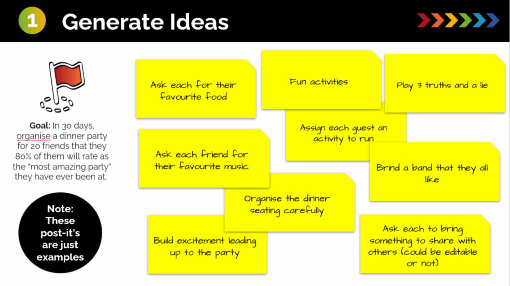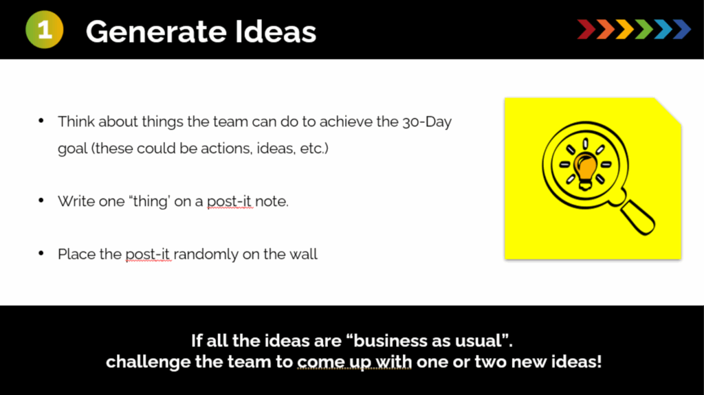 After a brief period of idea generation, ask the group to look at the wall of Post-it notes to see if this inspires additional ideas. You can do another round of individual “ideation” with post-it notes. If the ideas are all related to doing things a little better, challenge them to come up with completely new ideas.