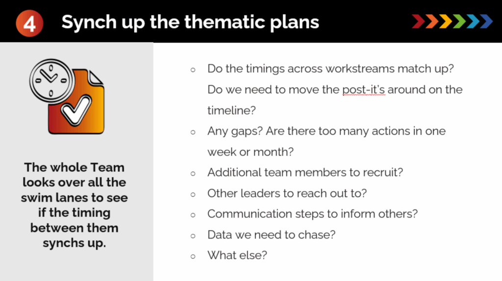 The whole team reviews all the swim lanes’ timelines to see if there are any gaps, or too many action steps in one timeframe, or if actions across swim lanes need to be better aligned. They discuss and make adjustments as needed.