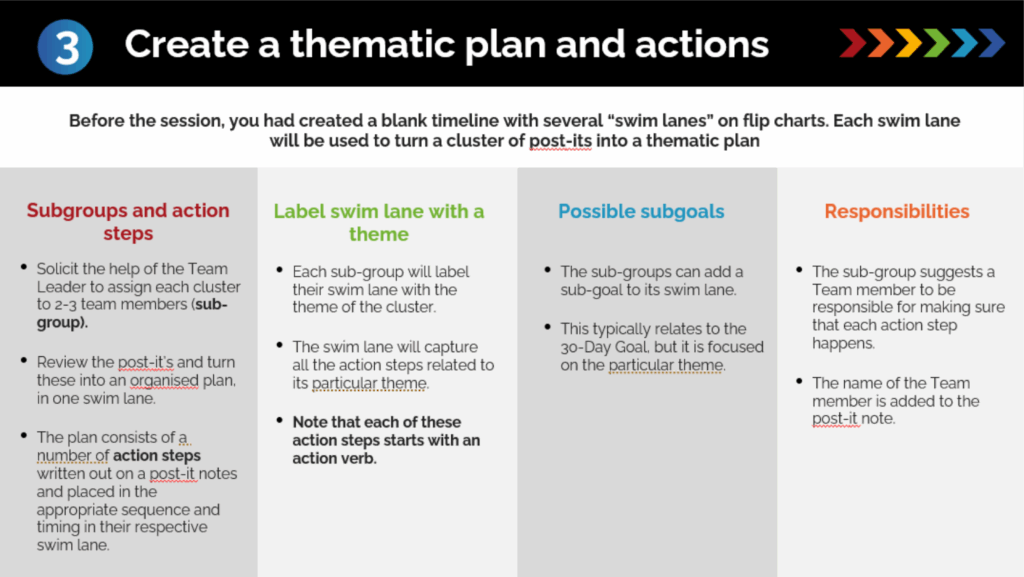 Each subgroup discusses the post-it notes in each of their clusters, consolidates some of them if needed, and turns each into an action step. Then, they move them to the corresponding swim lane, placing them in the right time frame. They can also begin assigning team member names to each one (one name per post-it note).