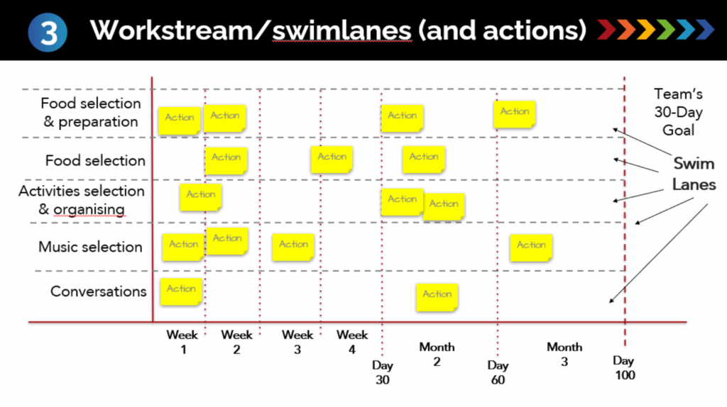 The whole team does a “stress-test” to the emerging plan, represented by these post-it notes in the swim lanes. “Does completing these action items give us high confidence that the Goal will be achieved”? If the answer is no, challenge the team to identify missing work streams and identify action steps within this.