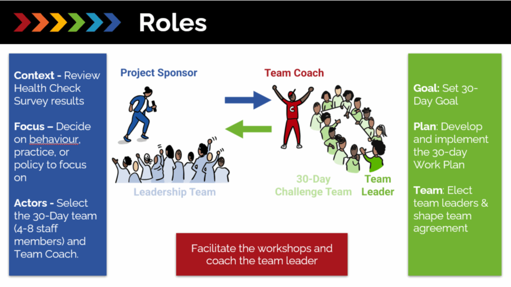 Share the slide on the team to clarify the roles of Project Sponsor, Team Members and Team Coach. This is a good slide to use for the next step of transitioning.
