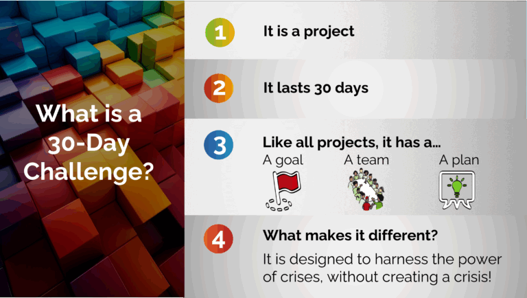 “This is the work we will be doing today. But before we shape our 30-day goal, let’s pause to see what questions you may have about 30-Day Projects and how they are similar and different from regular projects.”