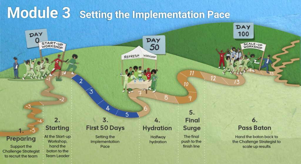 They will participate in the last part of the Refuelling Workshop, halfway through the 100 days, to see what additional support the team needs, and to begin to plan with the team for sustainability and scale-up.